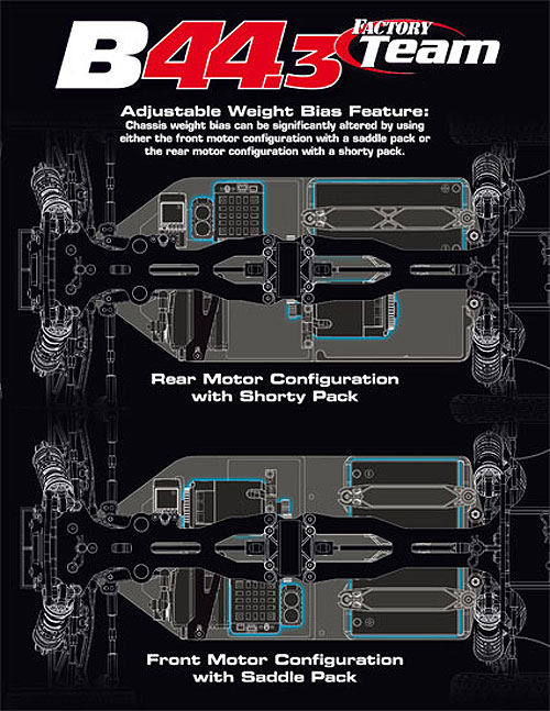 • Neues harteloxiertes 7075-T6 Aluminiumchassis mit variabler Motor und Akkuposition; Front oder Mittelmotor möglich.