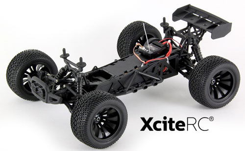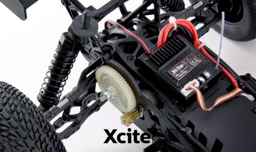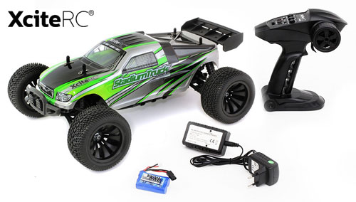 Fahrfertig montiertes Auto, XciteRC XRC-2i 2,4 GHz Fernsteuerung, 2in1 Regler/-Empfängereinheit, Lenkservo, Ladegerät, Bedienungsanleitung und 850 mAh Lilo Akku im Blisterkarton.