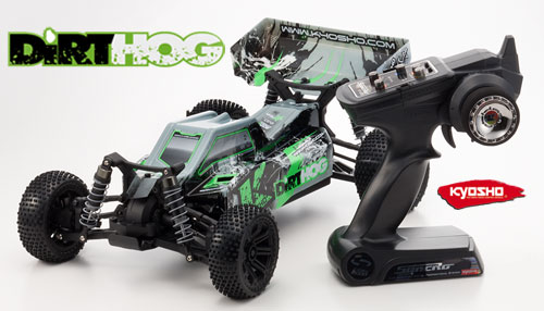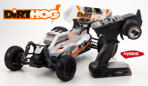 | | Mit dem Dirt Hog bringt Kyosho einen 4WD-Buggy für die Klasse 1:10-Offroad an den Start. Dabei konnte man im Bereich des Fahrwerks auf die rennerprobten Komponenten des Fazer zurückgreifen und sich ganz gezielt der Neuentwicklung des Chassis und des Antriebsstranges widmen. Dabei herausgekommen ist ein 4WD-Modell vergleichbar mit dem Lazer ZX-5, jedoch ist es weniger auf Rennen sondern mehr aufs Bashen vor der Haustür ausgelegt.