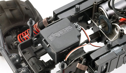 Ein weiteres Highlight ist das im Modell fahrfertig montierte 2,4GHz KT-200 SYNCRO-Fernsteuersystem mit einem wasserdichten Hochleistungs- Lenkservo! Das Servo verfügt über besonders kurze Stellzeiten und hohes Haltemoment. So werden Ihre Steuerbefehle auch unter härtesten Bedingungen 1:1 im Modell umgesetzt.