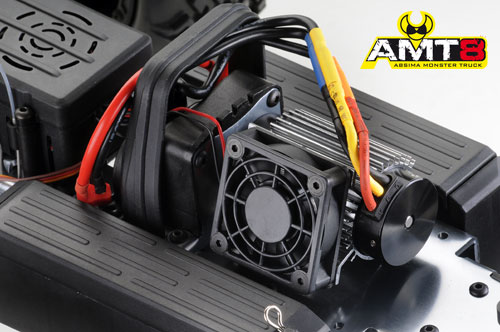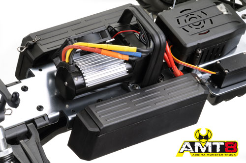 Elektronik mit Nehmerqualitäten: sowohl der wasserdichte Brushlessregler mit dem 2260 KV Hochleistungsmotor, wie auch die 2 hängenden 9 Kg Metallgetriebe Lenkservos sind sehr effektiv und leisten Ihren Dienst auch im schwierigen Terrain. Zudem sitzt der Empfänger in einer wassergeschützten Empfängerbox. Für die nötige Frischluft sorgen Lüfter am Speedregler und am Motor. Der komplette Antrieb ist für die enorme Brushless Power ausgelegt und so arbeiten die Getriebe und Wellen zuverlässig. Die Mittel - Motor - Position sorgt für einen optimalen Schwerpunkt und unterstützt dadurch das exzellente Handling des AMT8.