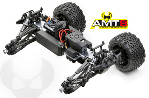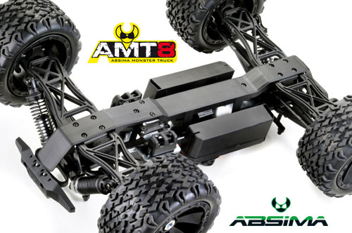 Das Chassis dominiert da dass massive U-Profil aus Aluminium das als Versteifung dem Chassis Stabilität verleiht. Die im Saddle Pack Layout angebrachten Akku - Boxen sorgen für eine optimale Chassisbalance. Dadurch sind auch wilde Fahrmanöver möglich ohne das der AMT8 eine Rolle seitwärts macht. Die Akku - Boxen dienen zudem als Spritzwasserschutz für die Fahrakkus.