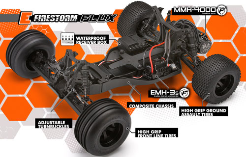 Die großen Reifen und die breite Offroad Renn-Aufhängung bedeutet nicht nur, dass der E-Firestorm Flux schnelle Rundenzeiten auf Ihrer Rennstrecke erreicht, sondern dass er genauso gut für HARDCORE BASHING geeignet ist! Spektakuläre Sprünge im Skate Park? Defininitv jede Menge Spaß! Vertikale Sprünge abliefern? Ganz locker! Unglaublich lange Sprünge? Gar kein Problem! Der E-Firestorm Flux schafft das alles und schreit anschließend noch nach mehr!