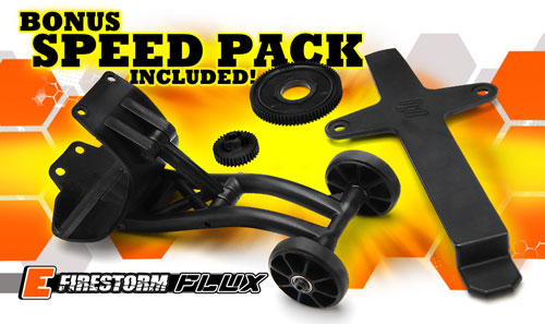 Der aktualisierte E-Firestorm Flux beinhaltet ein Bonus Speed Pack, das mit einem 77 Zähne Hauptzahnrad und einem 35 Zähne Ritzel für unglaubliche Höchstgeschwindigkeiten kommt. Zusätzlich mit dabei ist ein 3S LiPo Band für Extra Power und eine Wheely Bar, um den Truck jeder Zeit unter Kontrolle halten zu können! Die verbesserte Blitz SC Racing Slipper Kupplung ist ebenfalls verbaut und bietet eine bessere Kontrolle vom Truck sowie mehr Schutz für den Antrieb.