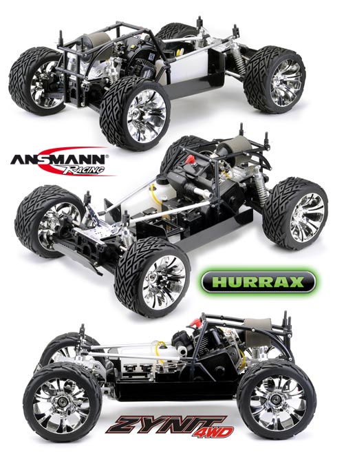 | | Ansmann Racing präsentiert mit dem Zynit 4WD 1/5 Off-Road Truggy das zweite Hurrax Großmodell. Der Zynit baut auf der bewährten Allrad-Antriebsplattform des sehr erfolgreichen Buggy Crypton 4WD auf. Um der erhöhten Belastung aufgrund der riesigen Truggy-Räder im Bereich des Antriebsstrangs und des Fahrwerks gerecht zu werden, sind folgende Tuningteile am Zynit 4WD bereits werkseitig verbaut: