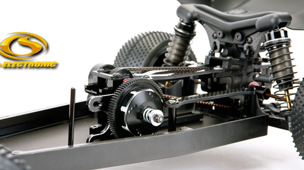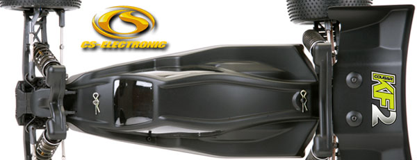 Das Aluminiumchassis ist dunkelgrau eloxiert und 2,5mm stark. Unterstützt wird die Chassisplatte von Seitenteilen aus Kunststoff und Alu. Auf ein Topdeck hin zur Vorderachse kann dadurch verzichtet werden. Die Motorhalterung ist im KF2 wieder konventionell gehalten. Sehr leicht soll das neue Slippersystem einzustellen sein.