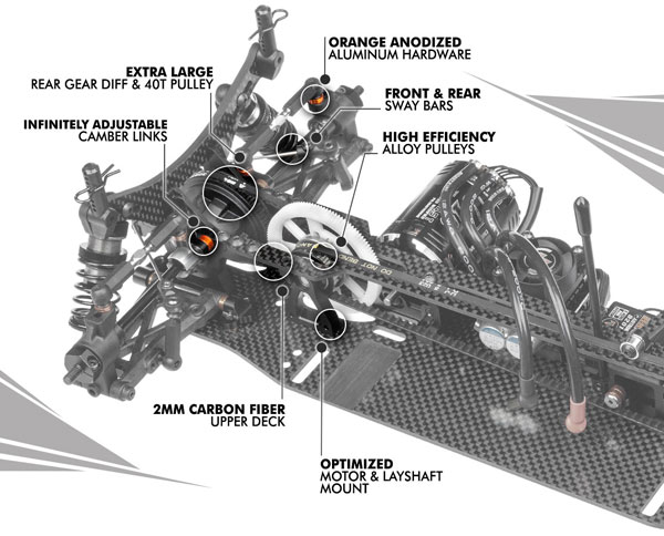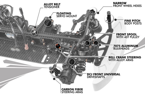 Auf den ersten Blick ist der PRO5 ein normaler Tourenwagen der heutigen Zeit. Erst bei genauerem Hinsehen fallen die neuen und sehr raffinierten Details und Feinheiten auf. Das Chassis ist aus 2.25mm starkem Kohlefaser gefertigt, und mit Bulkheads aus 7075 Aluminium bestückt. Die Motorhalterung und die Mittelantriebsachse wurden für eine bessere Gewichtsverteilung und mehr Effizienz komplett neu entwickelt. Das 2mm starke Topdeck ist mit den Bulkheads verschraubt und hält so den Antriebsstrang stabil. Der PRO5 beinhaltet eine schwebende Servohalterung aus Karbon und eine schwebende Akkuhalterung, sodass das Chassis gleichmäßig arbeiten kann und ein gleichmäßiges Fahrverhalten bei allen Streckenbedingungen bietet.