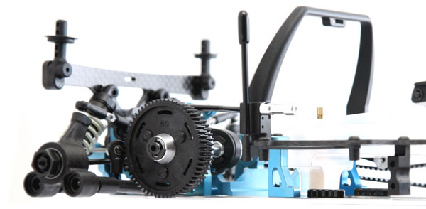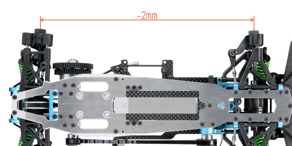 Neue hintere untere Querlenker verkürzen den Radstand um 2mm im Vergleich zum Vorgängermodell und verbessern somit das Fahrverhalten auf engen Kursen. Die optimierte Stoßdämpferposition ermöglicht es, die Stoßdämpfer vor der Dämpferbrücke zu montieren, und verbessert zudem die Traktion. Die Chassisplatte ist nahezu symmetrisch und zeichnet sich durch eine gleichmäßiges "Flexen" aus.