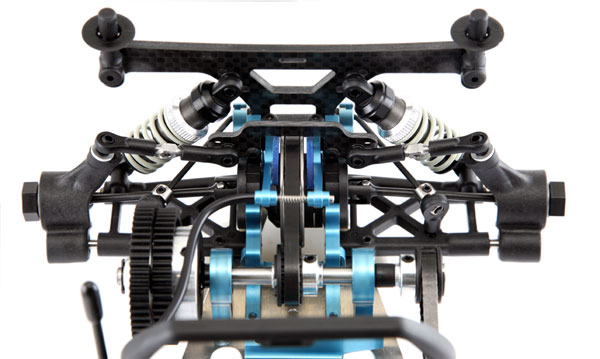 An der Hinterachse ersetzt eine Rechts-Links-Gewindestange den oberen Querlenker, um die Traktion beim Beschleunigen zu verbessern und das Gewicht zu senken. An der inneren Befestigung aus hochwertigem Kohlefaser sind 4 Einstellpositionen vorhanden, während am Achsschenkel zwei Befestigungspunkte sowie die Verwendung von Einstellscheiben eine Vielzahl von Setup Möglichenkeiten ergeben. Die neuen Kugelköpfe und Pfannen für die Anlenkung sind nahezu wie spielfrei und weisen einen deutlich geringeren Verschleiß auf.
