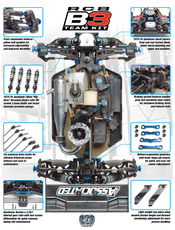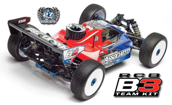 | | Thunder Tiger schickt mit dem Team Associated RC8B3 sein neues Flaggschiff für die 1:8 Nitro 4WD Wettbewerbs- Buggy Klasse ins Rennen. Bereits vor seiner offiziellen Markt-Einführung konnte der RC8B3 überzeugen.