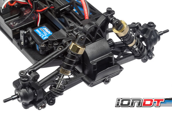 Der Maverick iON DT verfügt über einen kompletten Satz Öldruckstossdämpfer mit goldenen Kappen. Diese goldenen Kappen verleihen dem Fahrzeug einen besonders edlen Look und sind sehr stylisch und cool! Die Radaufhängungen sind auch sehr robust und in bewährter Dopperquerlenker Version mit stabilen C-Hubs an der Vorderachse, und extra harten Radträgern an der Hinterachse konstruiert. Das starke MS-28 Servo gibt die Lenkbefehle präzise an die Zweiarm-Lenkung weiter, welche durch den integrierten Servo Saver perfekt vor harten Einschlägen geschützt wird.