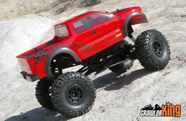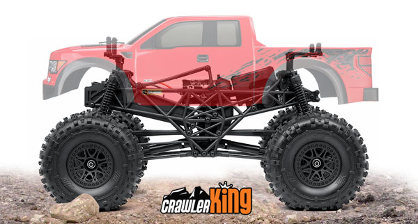 Der Crawler King ist mit einer wunderschönen Ford Raptor Karosserie ausgestattet und die Karosserie ist sogar schon fertig lackiert und beklebt. Die schwarzen Beadlock-Style Felgen mit 8 Speichen und die HB Rover Reifen runden das tolle Aussehen des Trucks ab.