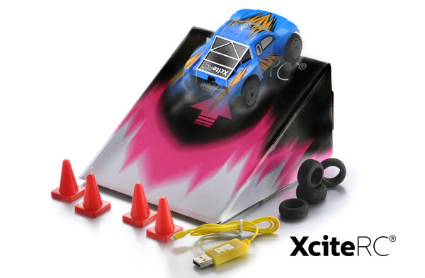 Im Lieferumfang enthalten sind neben dem Modell selbst die passende XciteRC 2,4-GHz-Fernsteuerung sowie jede Menge Zubehör wie eine Sprungschanze, vier Pylonen, ein extra Satz Reifen und ein USB-Ladekabel.