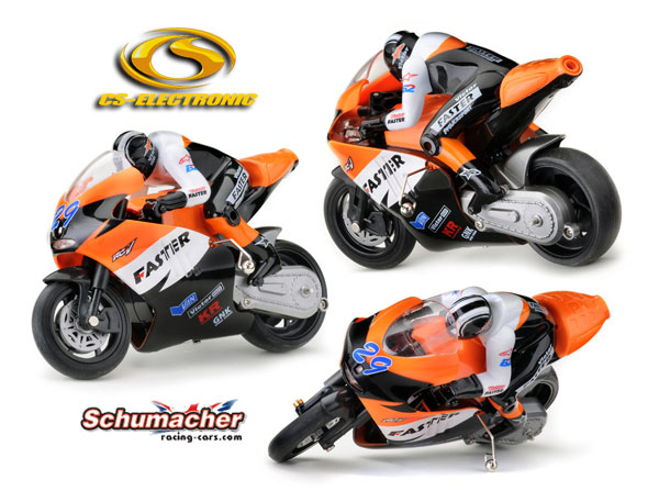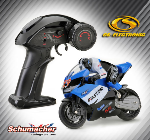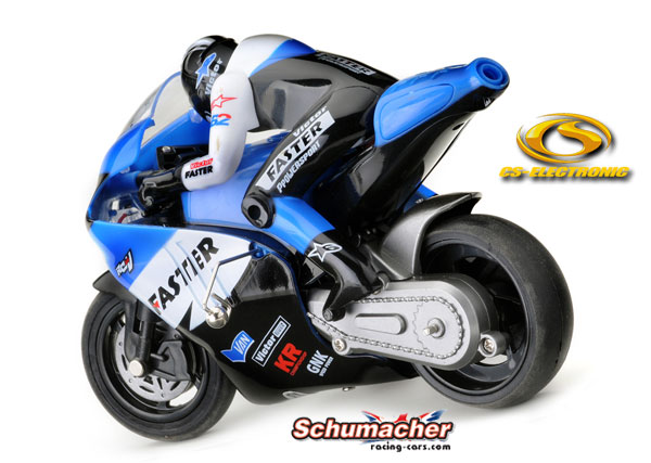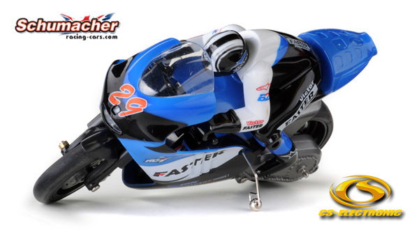 | | CS Electronic präsentiert das neue Racing Mini Bike von Schumacher Racing. Dieses Mini Bike verfügt über einige Features die dieses Racing Bike zu einem Spaß Modell, für die Rennstrecke, Zuhause oder im Büro macht. Der integrierte Kreisel, verleiht dem Bike ein extrem einfaches Handling und eine Top Performance für alle RC- Enthusiasten.