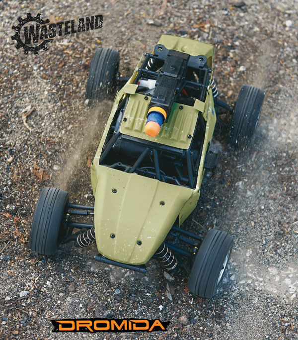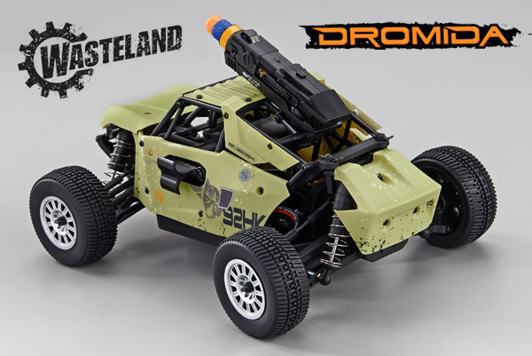| | Der Dromida Wasteland Buggy 1/18 RTR 2.4 GHz basiert auf dem bewährten Dromida DB4.18 Desert Buggy. Das besondere Feature ist der auf dem Dach montierte, funktionsfähige Raketenwerfer, der die Schaumstoffraketen über ein Federkatapult verschießt. Verfolgt eure Gegner und "schießt" sie von der Strecke!