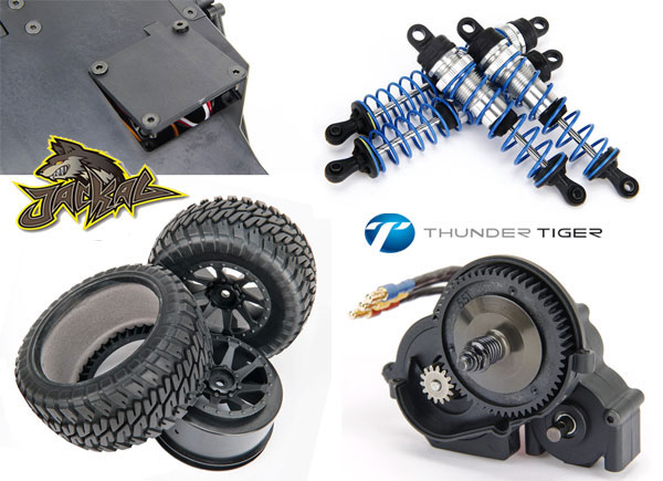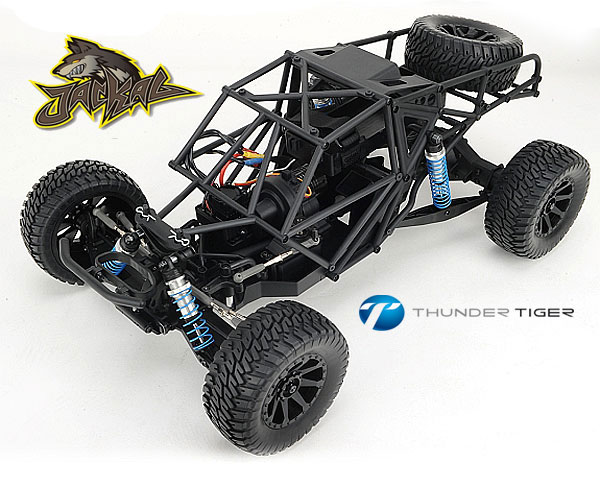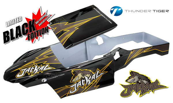 | | Thunder Tiger präsentiert den JACKAL 1:10 Brushless 4WD Desert Buggy RTR in einer Limitierten BLACK Edition. Ein 4WD Brushless DESERT BUGGY in R/C Water Proof RTR Version komplett vormontiert inkl. Regler, Motor, Servo, Pistolen-Fernsteuerungs-System und genial originalgetreuer Optik
