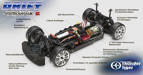 | | Der Sparrowhawk DX Drift Elektro Tourenwagen wurde entwickelt um dem ambitionierten RC-Car Fahrer die bestmöglichste Ausstattung zu einem erschwinglichen Preis anzubieten. Der Sparrowhawk DX hat ein 4WD Tourenwagenchassis als Basis. Er wurde mit speziellen Drift Reifen ausgestattet. Spektakuläre Drifts sind so möglich! Atemberaubende Lackierungen und Chromfelgen mit Bremsscheibenlook runden das Paket ab. Zusätzlich wurde ein LED Lichtset eingebaut. Folgende Lichter werden automatisch geschaltet: Abblendlichter, Blinker, Bremslicht, Warnblinker, Nebelscheinwerfer, Lichtflash bei Beschleunigung & Warnton bei Rückwärtsfahrt. Ein weiterer Vorteil der SPARROWHAWK Serie ist die Verwendung einer modularen Bauweise der Chassis, so sind viele Teile und Komponenten baugleich mit der neuen TOMAHAWK Serie. Das durchdachte Modell ist von Werk aus aufgebaut und sofort fahrbereit.