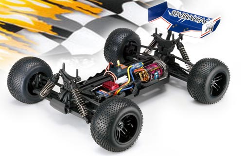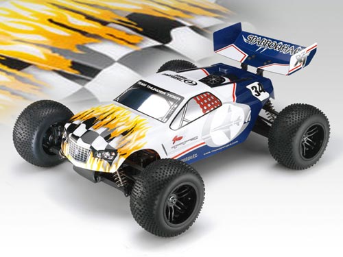 | | Thunder Tiger präsentiert mit dem Sparrowhawk XT einen weiteren Stadium Truck im Maßstab 1:10. Ausgestattet mit einem kraftvollen 19 Turn 550 Super Sport Motor ist dieser Truck nicht zu stoppen. Langen Querlenker sorgen zusammen mit den Gripp Pin Reifen für ein perfektes Fahrverhalten, sogar auf härtestem Untergrund. Großvolumige Öldruckstoßdämpfer stecken selbst höchste Sprünge weg.