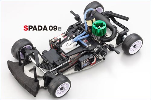 Der Spada 09L ist auf einem sehr leichten Chassis aus 17S Duraluminium aufgebaut, das die solide Basis für den Boliden darstellt. Die L-Version ist besitzt einen 24 mm längeren Radstand und die Materialstärke des Chassis ist auf 3 mm angewachsen. Und auch die Bodenfreiheit wurde beim 09L auf 8mm angehoben, um den Einsatzbereich zu erweitern. Die Kraftverteilung erfolgt auf alle vier Räder über ein sehr leichtgängiges Zahnriemensystem. Die Vorderachse ist als Starrachse ausgelegt. Die Hinterachse ist mit einem hochwertigen Kugeldiff ausgestattet, das sich stufenlos sperren lässt. Der gesamte Antriebsstrang ist mit 14 Kugellagern komplett gelagert. Das Herzstück des SPADA ist der fast schon legendäre Sirio 09 Verbrennungsmotor, der sein erfolgreiches Debüt im Mini Inferno Zero Nine gefeiert hat. In Verbindung mit dem Resonanzrohr, verfügt er über ein enormes Grunddrehmoment und eine lineare Leistungsentfaltung. Die Kraftübertragung auf den Antriebsstrang erfolgt über eine Zweibackenkupplung auf das 2-Gang-Getriebe. Das Tanksystem wurde ebenfalls neu konzipiert und exakt auf das Chassis des SPADA angepasst. Der Tank verfügt über einen Inhalt von 38 ml, womit Fahrzeiten von bis zu 7 Minuten erreicht werden.