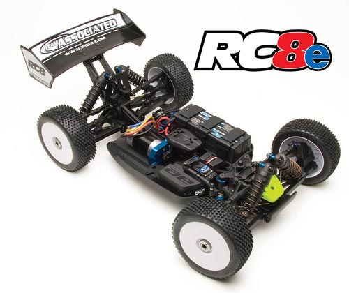 | | Team Associated präsentiert den RC8e, einen 1/8 Buggy mit Elektroantrieb basierend auf dem erfolgreichen RC8. Das Area 51 Design Team entwickelte ein Konzept für den RC8e, das die Vorzüge der Verbrennerversion des RC8, die ausgezeichnete Haltbarkeit, Stabilität, Kurvenverhalten, Flugverhalten sowie das unschlagbare Handling auf schwierigem Untergrund, in der Elektrovariante vereint. Jedes spezielle Feature des RC8e, wie das hart anodisierte, CNC- gefräste Chassis, optimierte Gewichtsverteilung, Composite „BigBore“ Stoßdämpfer mit 4mm Gold-Kolbenstangen, einer veränderten Lenkgeometrie sowie den ultraleichten Felgen schreit förmlich die Performance dieses Modells heraus.