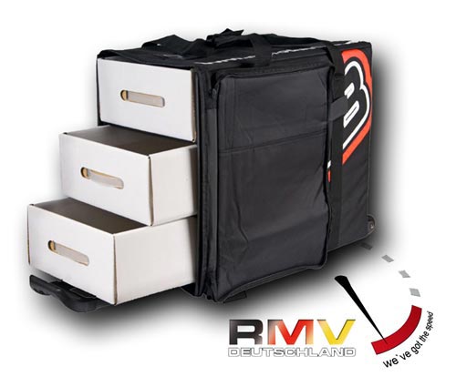 | | RMV präsentiert die praktische RB Concept Racing Trolley Tasche in den klassischen RB Farben schwarz und orange. Der robuste RB Trolley ist ausgelegt für den Transport von 1/8er Modellen, Zubehör wie Motoren, Reifen und den entsprechenden Ersatzteilen. Diese Tasche besitzt 3 Schubfächer mit einem Innenmaß von 490mmx230mmx130mm in denen das Material ordentlich verstaut werden kann.