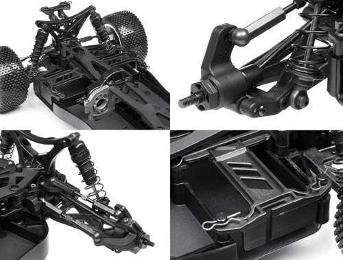 Für beste Kontrolle, Haltbarkeit und Effizienz, hat HPI dem Cyber 10B einen komplett Kugelgelagerten Antriebsstrang verpasst und ihn mit super geschmeidigen Diffs vorne und hinten ausgestattet. Der Motor wurde längs im Chassis montiert und der Akku liegt quer im hinteren Bereich des Chassis. Die Kugelgelagerte Lenkung sorgt für präzise Arbeit und das Aufhängungsdesign ist, wie gesagt, direkt vom Hot Bodies D4 Racing Buggy übernommen worden.