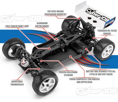 | | Der Cyber 10B ist ein komplett neu entwickeltes Chassis, das erfahrene Renntechnik mit einem günstigen Preis vereint. Mit dem Cyber bekommt man das Wissen aus Jahrelangen Rennerfahrungen im Offroad Bereich des Hot Bodies Racing Teams. Sowie erprobte World Champion Racing Technology vom Hot Bodies D4 und jede Menge Spaß. Das alles ist in dem "build-it-yourself" Baukasten für einen weitaus günstigeren Preis, als für andere Hochleistungschassis, enthalten.