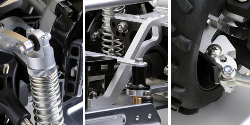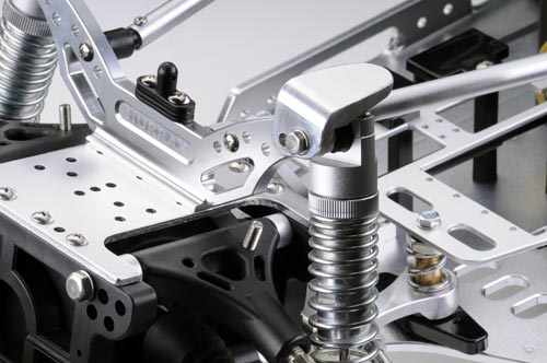 Fahrwerk & Lenkung | Extrem robuster Chassis- und Fahrwerksaufbau | Sturz und Spur an Vorder- und Hinterachse variabel einstellbar | Extreme Variabilität beim Fahrwerkssetup inkl. variablen Radstand | Geringe Kippneigung aufgrund niedrigen Schwerpunkts und breiter Spur | Riesige Federwege an Vorder- und Hinterachse | Einstellbare Aluminium Stoßdämpfer inkl. progressiver Federn | Ausschließliche Verwendung von Selbstsichernden Muttern zur Fixierung der Schrauben und Wellen (E-Clip freies Design) | Aluminium Radlager inkl. Aluminium Lenkhebel vorne | Dämpferbrücke vorne und hinten aus Aluminium | Einstellbarer Ein- und Ausfederanschlag | Stufenlos einstellbarer Aluminium Servosaver | Untere Querlenker in verschiedene Flexibilitäten verfügbar (Option) |