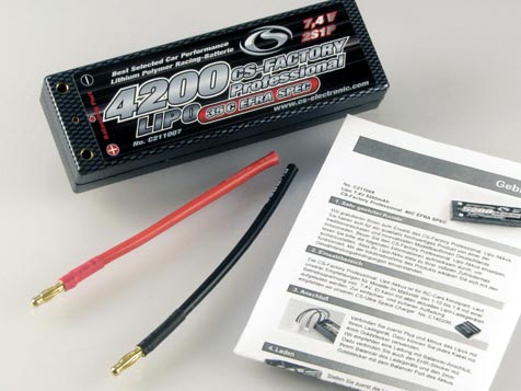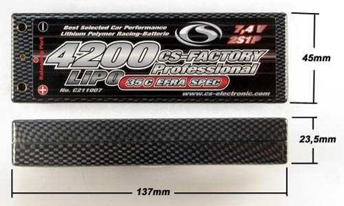 | | Der CS-Factory Professional 4200mAh Lipo Pack besticht durch seine hervorragende Performance im RC Car-Wettbewerbsbereich. Durch neue Materialien und einer aufwendigen Selektion werden die Lipo-Zellen genau aufeinander abgestimmt und ermöglichen dadurch eine sagenhafte Dauerentladung von 35C. Basis dafür sind die neuesten und hochwertigsten Lipo-Zellen, Made in Korea. Zudem verfügen die CS-Factory Professional Lipo Packs über eine sehr hohe Spannungslage über den gesamten Entladebereich, was sich in einer sehr guten Performance wieder spiegelt.