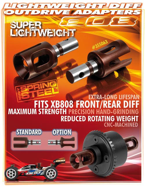 | | Um die rotierende Masse im Antriebsstrang des XB808 weiter senken zu können, kommt nun ein spezieller Abtrieb für das Active-Diff von XRAY auf den Markt. Die sehr steife und dennoch leichte Konstruktion kann ohne weitere Nacharbeiten direkt im Active-Diff verbaut werden. Gefertigt wird der Diffausgang aus hochwertigem HUDY-Federstahl und passt in das Active-Diff unter Bestellnummer 355102, zum Lieferumfang gehören zwei Stück.