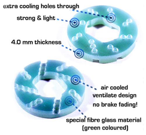 | | PSM Racing präsentiert eine neue 4mm Bremsscheibe aus Glasfaser- Material (Epoxy) für den Mugen Seiki MBX-6. Die neue Bremsscheibe ist wegen der vielen Lüftungsöffnungen sehr leicht und hitzebeständig und biete eine unglaubliche Bremsleistung. Die PSM Bremsscheibe kann problemlos gegen die Original Scheiben ausgetauscht werden und sollte mit unbelegten Bremsbelägen benutzt werden.