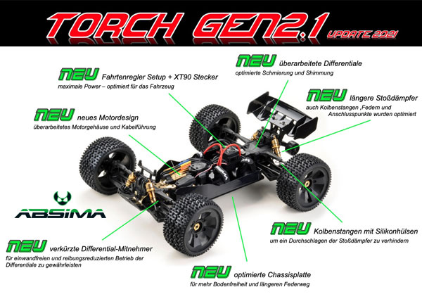 | | Der 1:8 ABSIMA Truggy TORCH Gen2.1" 6S ist jetzt noch robuster als je zuvor! Aufgrund der vielen Erfahrungen, die Absima mit ihrer ersten Serie gewonnen hat, konnten Sie einige Updates durchführen um die Leistung und Haltbarkeit weiter zu verbessern. Diese Updates beruhen auf den Erfahrungen ihrer Kunden und Sie freuen sich, dass Sie einige davon entsprechend umsetzen konnten.