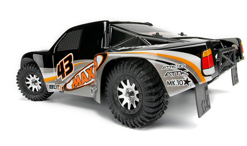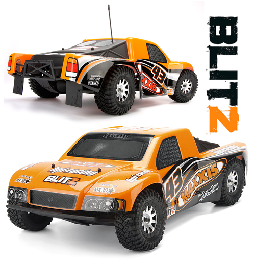HPI Racing präsentiert jetzt mit dem „Blitz“ auch einen 1/10 Elektro Short Course Truck. Der Blitz basiert auf einer verlängerten Version des Firestorm Chassis, das seine Fähigkeiten längst bewiesen hat. Der Blitz ist sowohl der perfekte Off Road Basher, als auch ein überragend zuverlässiges Rennfahrzeug. Er hat ein traumhaftes Fahrverhalten. Er wird mit einer detaillierten MAXXIS ATTK-10 Replika Karosserie wie sie in amerikanischen Rennen zu finden ist, ausgeliefert. Offiziell lizenzierte Maxxis Trepador Comp Reifen liefern Grip auf allen Untergründen und 3 Grad Hinterachsträger halten die Hinterachse in der Spur.