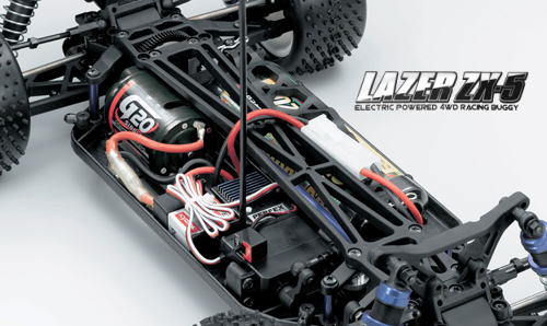 | | Mit dem ZX-5 RTR setzt Kyosho die legendäre Serie der Elektro-Buggys fort, die mit Modellen wie Progress oder Optima vor vielen Jahren begonnen hat. Die Technik des neuen RTR-Racers hat mit damals jedoch nichts mehr zu tun. Der ZX-5 ist auf einem Kunststoffchassis aufgebaut, das aus einem speziellen Kunststoff mit hohem Glasfaseranteil gefertigt ist. Dadurch verfügt das Chassis über eine hohe Torsionsfestigkeit und genügend Elastizität für den harten Renneinsatz. Die Kraftübertragung erfolgt über ein leichtgängiges Kardansystem. Der Antrieb ist mit einem Slipper ausgestattet und schützt den Antrieb vor unerwünschten Schlägen. Die obere Chassisplatte im X-Design verleiht dem gesamten Chassis die erforderliche Verwindungssteifigkeit.