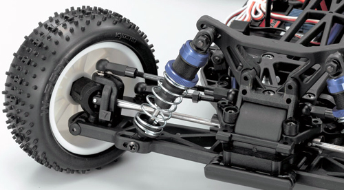 Ganz neu im ZX-5 sind die Twin-Cap-Stoßdämpfer mit großem Durchmesser des Dämpfergehäuses. Die Justierung der Federvorspannung erfolgt sehr feinfühlig über Rändelmuttern. Durch verschiedene Montagepunkte der Dämpfer im Modell, können komplexe Setups für jede Rennstrecke erarbeitet werden. Vorder- und Hinterachse sind jeweils mit einem leichtgängigen Differenzialgetriebe ausgestattet. Beide Diffs sind als hochwertige Kugeldiffs ausgeführt. Der eigentliche Antriebsstrang ist exakt mittig auf dem Chassis positioniert. Das gesamte Chassislayout ist darauf abgestimmt, dass die Chassisbalance um Quer- und Längsachse völlig neutral ist.