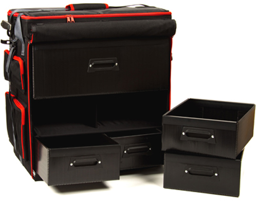 Die 5 Laden der Transportbox sind aus Kunststoff gefertigt, der Bezug der Tasche ist leicht zu reinigen. Außen finden sich großzügige Taschen mit Platz für Anleitungen, Setup Tools, Kleinteile und ein Setup Board.