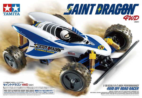 | | Der Saint Dragon war ein sehr populäres Modell der 80er Jahre aus der Reihe der japanischen RC Comic Fahrzeuge. Dieses unverwechselbare Karosseriedesign gibt es jetzt wieder als TAMIYA RC Modell auf dem 4WD Chassis des Fire Dragon. Das Modell wird als Bausatz ausgeliefert mit einer ausführlichen Anleitung und einer bereits vorlackierten Karosserie. Für die Fertigstellung der Karosserie müssen nur noch die Aufkleber aufgebracht werden.