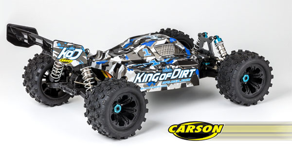 Dank wasserdichter RC-Komponenten macht er auch auf verschlammten Offroad-Pisten alles mit. Dabei beschleunigt das kraftvolle HOBBYWING Brushless-Set den knapp 3,5 kg schweren Buggy auf bis zu 80 km/h. Der tiefe Schwerpunkt und zahlreiche Setup-Optionen sorgen für perfekte Bodenhaftung und lassen den CARSON King of Dirt über alle Strecken brettern. Ausgeliefert wird der King of Dirt mit einem störungsfreien 2.4 GHz Fernsteuerungssystem inklusive Failsafe. Bereit für die Action? Kaufen – Laden – Action!