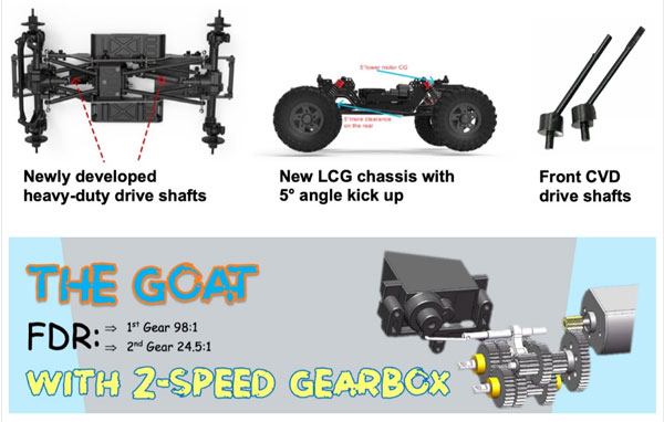 Das Herzstück dieses Modells ist ein 2-Gang Getriebe und das neue LCG Concept Chassis, das mit einer überarbeiteten Stoßdämpfergeometrie für maximale Leistung ausgestattet ist. Die neu entwickelten, einstellbaren Big Bore Öldruckstoßdämpfer sorgen für eine optimale Federung und Kontrolle in jedem Gelände. Dank des SOA-Setups (Servo-On-Axle) bietet der GOAT ein verbessertes Lenkverhalten, das die Vorteile der neuen super-griffigen Oversize-Reifen voll ausschöpft.