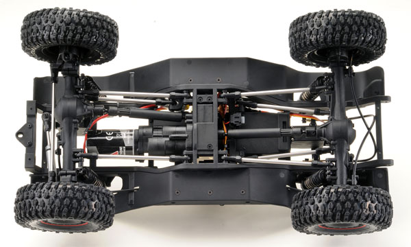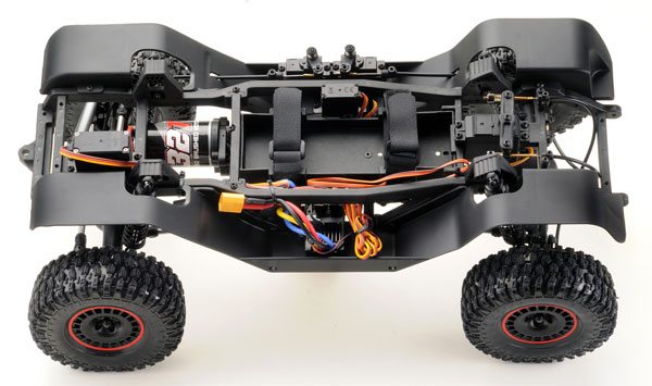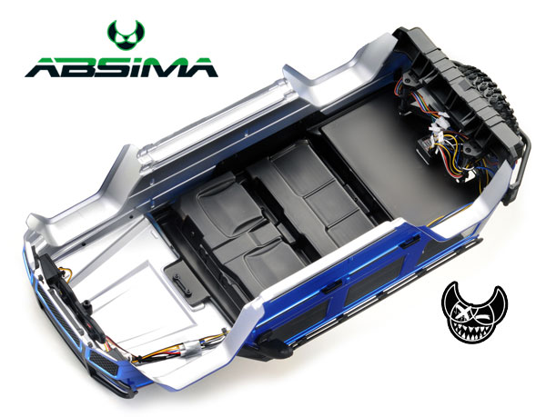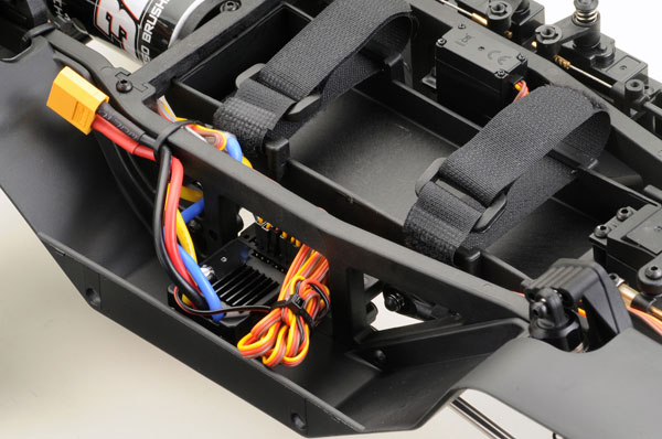 Die Batteriebox liegt mittig und kann dank Klettverschluss und verstellbarer Halterung perfekt an alle 2-3S Lipo und 6-7 Zellen NiMH Batterien angepasst werden. Die 11-Kanal Fernsteuerung ist notwendig, um all die technischen Features ansteuern zu können. Die 3-in-1 ESC/Empfängereinheit und die Lichteinheit sind separat gehalten um den Piloten alle Möglichkeiten für zukünftige Optimierungen/Tuningmaßnahmen offen zu halten.
