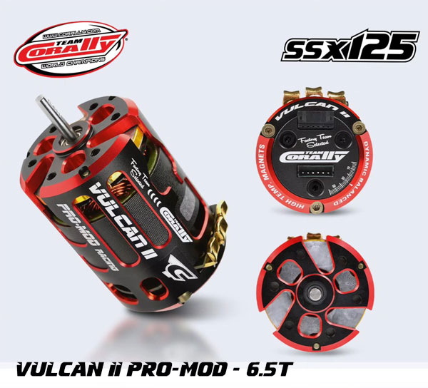 | Um den Corally SSX125 für Höchstleistungen auszurüsten, ist die Auswahl hochwertiger Elektronik entscheidend. Ob modifiziert oder serienmäßig, der richtige Motor gewinnt Rennen. Für modifizierte Modelle ist der Vulcan II 6.5T unsere erste Wahl - explosiver Punch mit gleichmäßiger, kontrollierbarer Leistung. Du fährst serienmäßig? Wähle den Vulcan II mit 13.5T oder 17.5T, passend zu deinen Klassenregeln.