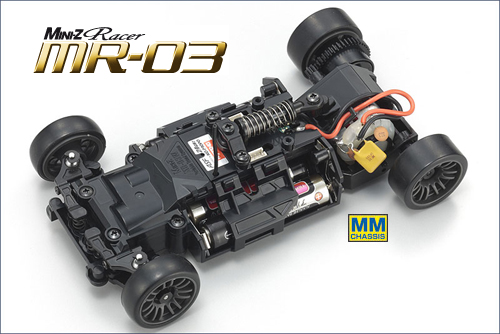 Die Lieferung erfolgt ohne Sender. Für den Betrieb ist ein Kyosho Perfex KT-18 (Artikelnummer 82001) erforderlich. Ins Mainboard des MR-03 ist ein FET-Regler integriert, der den Elektromotor sehr feinfühlig ansteuert. Zudem verfügt es serienmäßig über ein ICS-Interface. Mit einem speziellen USB-Kabel und einer Software (nicht im Lieferumfang enthalten) lässt sich das Chassis per PC/Notebook konfigurieren. Das Setup des Fahrzeugs ist somit komfortabel auf der Festplatte speicherbar. Für die Umsetzung der Lenkbefehle sorgt ein Digitalservo mit Coreless-Motor und einer Getriebeübersetzung von 94,41:1. An die Regler-Empfänger-Einheit RA-22 kann optional ein Gyro aus der dNaNo-Serie (Artikelnummer DNW-107) angeschlossen werden, um die Fahrstabilität zu erhöhen. Die Vorderräder sind einzeln aufgehängt und mit gefederten Doppelquerlenkern versehen. Die Hinterachse basiert auf bewährten MR-02-Komponenten. Sie ist mit einem Kegelrad-Differential versehen und als gefedertes Powerpod ausgelegt. Es liegen ein Satz Werkzeug sowie vier verschiedene Motorritzel zur Feinabstimmung des Antriebs bei.