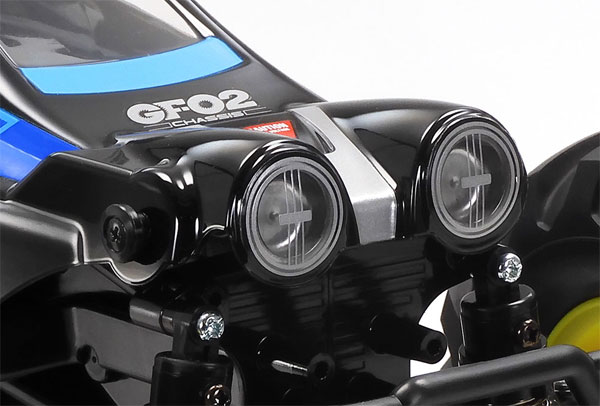 Das zahnradgetriebene 4WD-Chassis GF-02 zeichnet sich durch einen tief und zentral im leichten und robusten Monocoque-Rahmen positionierten Motor aus, der die Kraft über Zahnräder an Vorder- und Hinterachse überträgt. Der lange Radstand und die breite Spur sorgen für stabile Geländegängigkeit. Der schlanke Rahmen ist von Leiterrahmen inspiriert und verfügt über integrierte, abgedichtete Getriebe, die das Eindringen von Staub und Schmutz verhindern. Vorder- und Hinterachsdifferenziale ermöglichen sanftes Kurvenfahren, während separat erhältliche Ritzel drei verschiedene Übersetzungsverhältnisse bieten. Ein Motorschutz erhöht die Zuverlässigkeit im Gelände. Die Doppelquerlenkerachse an allen vier Rädern verfügt über vier Reibungsdämpfer, und die Lenkgestänge arbeiten mit Spurstangen gleicher Länge. Fluoreszierend gelbe, einteilige Tiefbettfelgen sind mit 123 mm großen Semi-Pneumatikreifen bestückt.