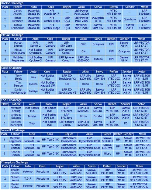 Auf der offiziellen Challenge-Homepage unter www.LRP-HPI-Challenge.com finden Sie zahlreiche weitergehende Daten und Informationen: die kompletten Ergebnisse und auch viele weitere Bilder zur DM 2011. Zusätzlich können Sie auch tagesaktuell alle Daten und Termine zur LRP-HPI-Challenge einsehen!