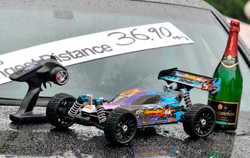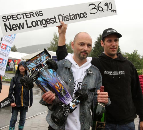Das gilt auch für den dritten Rekordversuch. Mit dem Specter 6S von CARSON-MODEL SPORT gelang der weiteste Sprung mit einem RC-Modell – 36,90 Meter. Für dieses Vorhaben war der robuste Buggy mit seinem festen Aluminium-Chassis und dem bärenstarken Brushless-System genau das richtige „Werkzeug“, zumal der brachiale Brushless-Motor ihn auf bis zu 100 km/h katapultiert.