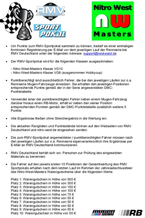 Der RMV-Sportpokal stellt in der Saison 2012 somit erstmals eine Ergänzung zum sehr beliebten Nitro-West-Masters dar und bietet auf diese Art einen weiteren sehr attraktiven Anreiz in Form von hochdotierten Warengutscheinen insbesondere für jeden Fahrer eines Mugen Seiki Fahrzeugs oder RB-Motors dar.