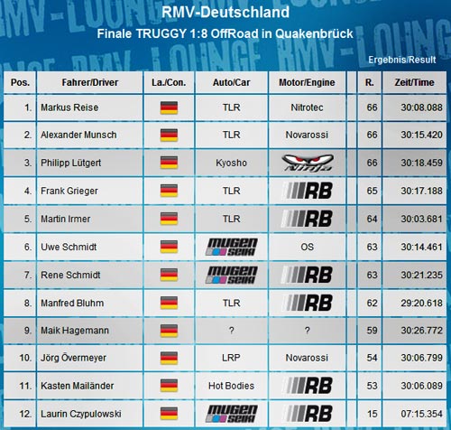 Die Finalläufe wurden jeweils über eine Laufdauer von 30 Minuten gefahren und im sehenswerten Truggy-Finale blieb es bis zum Ende ein offener Kampf um den Sieg zwischen Markus Reise und Alexander Munsch, welchen ersterer letztendlich mit einem Vorsprung von lediglich 7 Sekunden für sich entscheiden konnte.