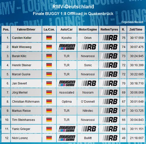 Bemerkenswert in diesem Zusammenhang ist sicherlich die Tatsache, dass die beiden Erstplatzierten Fahrer jeweils einen Tankstopp mehr als die anderen Finalisten einlegten und dennoch ungefährdet an der Spitze des Feldes fahren konnten. Ebenfalls erwähnenswert erscheint die Tatsache, dass sich die Buggy-Fahrer komplett einig waren und ausnahmslos auf die Qualitäten des WEC-Einheitsreifen in Quakenbrück funktionierenden RB-Speedline Dragon in der super-soft Mischung vertrauten.