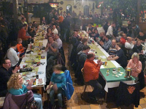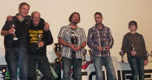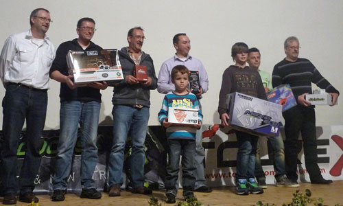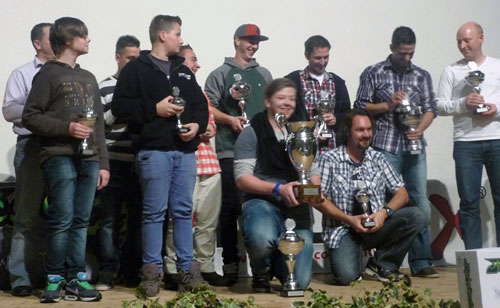 | | Es war der Schlusspunkt einer hervorragenden Rennsaison in den verschiedenen 1:8 OffRoad Klassen, der am Samstag den 17. November 2012 bei der Siegerehrung zum NRW-Cup OffRoad in Kalkar Apeldorn gesetzt wurde. NRW-Cup-Organisator Markus Dinkhoff zog erneut alle Register seines Könnens und stellte eine kurzweilige Veranstaltung auf die Beine, bei der nicht nur die jeweiligen Sieger geehrt, sondern auch viele tolle Sachpreise unter den anwesenden Besuchern verlost wurden. Waren schon die einzelnen Rennen im NRW-Cup durchweg gut besucht, so setzte sich dieser äußerst positive Trend bei der Jahresabschlussfeier fort, denn auch in Kalkar-Apeldorn kam erneut eine beeindruckende Anzahl an Besuchern zusammen, um der kurzweiligen Moderation von Markus Dinkhoff und RMV-Geschäftsführer Daniel Reckward zu folgen. Mit ihrer sympathisch lockeren Art begeisterten die beiden das anwesende Publikum und es wurde bei bester Stimmung bis zum nächsten Morgen um 02:00 Uhr gefeiert und gefachsimpelt.
