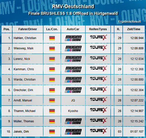 Sonntags waren dann auch die letzten Teilnehmer angereist, sodass 58 gewertete auf Zeitenjagd gehen konnten. Es wurde pünktlich um 9:00 Uhr mit dem zweiten Vorlaufdurchgang gestartet. Diesmal konnte Maik Wiesweg diesen für sich entscheiden. Den dritten sowie auch letzten Durchgang konnte Chris Hahlen für sich gewinnen. Ab 14:00 Uhr wurden dann die Finale gefahren. Ab dem 1/16 Finale mit je 10 Fahrern, wo aus jedem Finale bis zum Halbfinale immer drei aufstiegen. Ab dem Halbfinale dann fünf Fahrer aus A und B. Nun standen die Finalisten fest, von Pole startete Maik Wiesweg vor Chris Hahlen. Chris Kammann, Christian Warda, Nick Lorenz, Manuel Arndt, Michael Thamm, Dirk Jakels, Dirk Drechsler und Thomas Müller. Damit konnte das Finale über 12 Minuten gestartet werden, Maik Wiesweg kam sehr gut weg, machte aber in der fünften Runde einen Fehler, sodass Chris Hahlen vorbei fahren konnte. Maik Wiesweg konnte aber den Abstand immer um die eine Sekunde halten und hat ihn weiter attackiert und konnte weitere zweimal an ihm vorbei fahren. Wobei es jedes Mal zu einem Missverständnis mit Christian kam und Maik sich wieder erneut ran kämpfen musste. Am Ende waren es dann achtzehntel Sekunden an Vorsprung, den Christian Hahlen ins Ziel rettete. Ein super spannendes Finale und auch souverän mit acht Mugen Seiki MBX-6 ECO ein wahrer Beweis dafür, an diesem Brushless-Buggy kommt derzeit keiner vorbei.